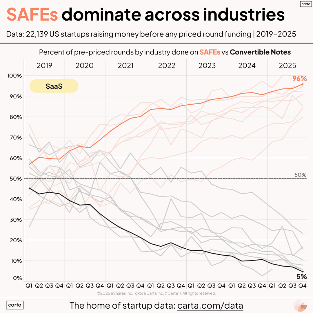 According to Carta, SAFEs are increasingly the go-to instrument for early-stage rounds compared to convertible notes. In 2025, they made up 90% or more of financings across most industries.