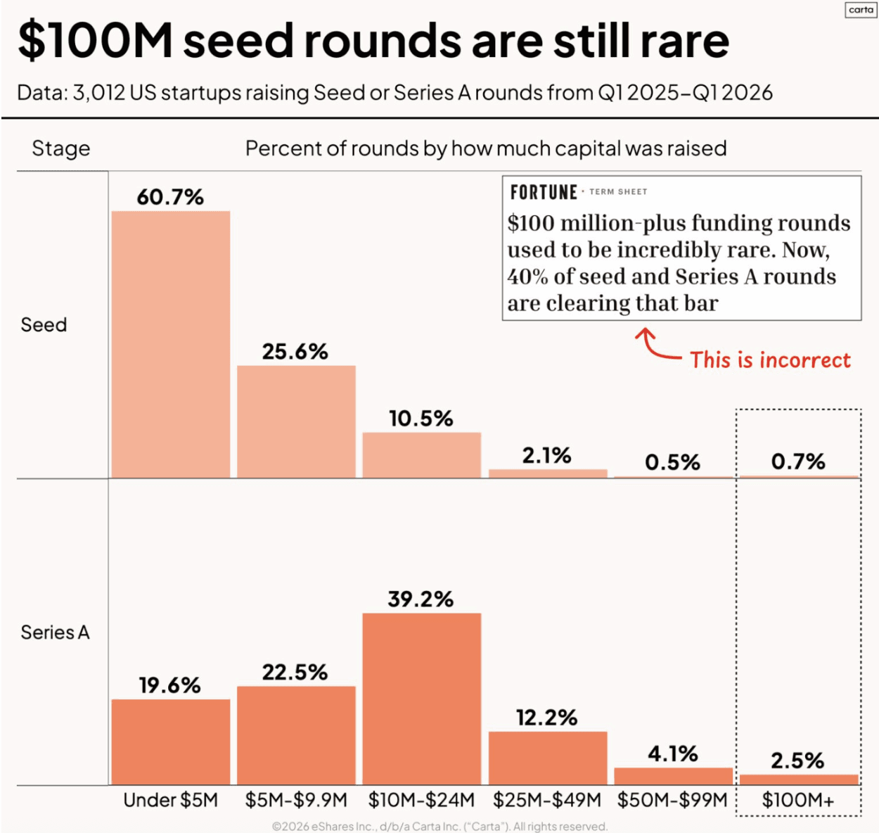 Despite recent headlines, $100M+ seed rounds are an outlier for early-stage companies. Over 60% of rounds are still under $5M, with only 0.7% reaching a nine-figure mark. Even at Series A, the majority of activity is concentrated in the $10M to $24M range, while $100M+ rounds account for just 2.5% of deals.