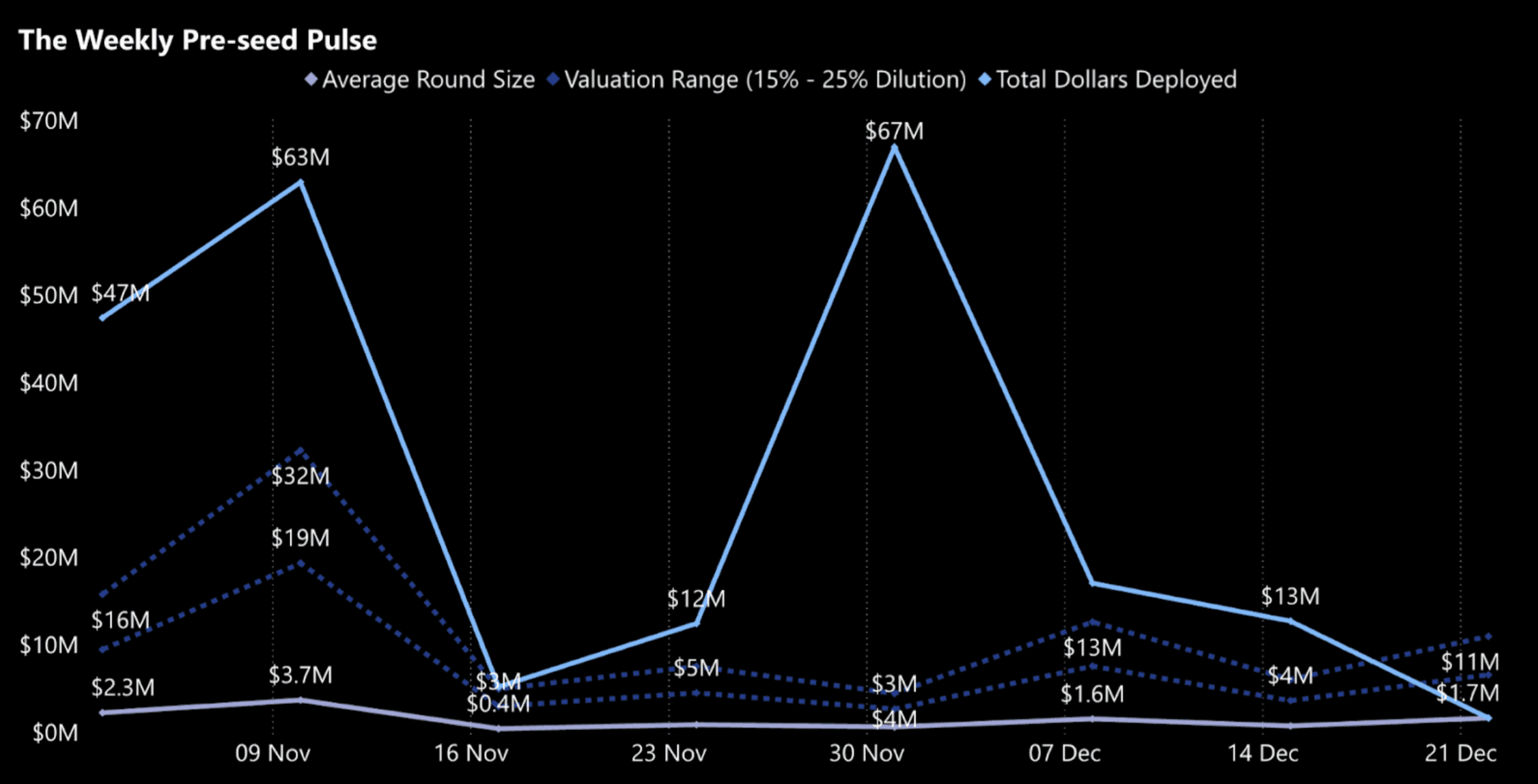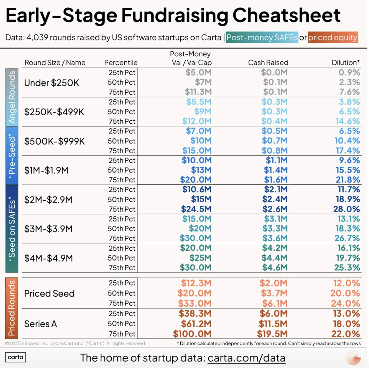 Carta’s new cheatsheet shows how dilution scales with pre-seed check size, among other key benchmarks. For rounds under $1M, the median dilution is 10.4%. Once raises cross $1M (up to $2M), median dilution jumps to 15.5%, a meaningful step-up showing how quickly ownership costs rise with larger early checks.