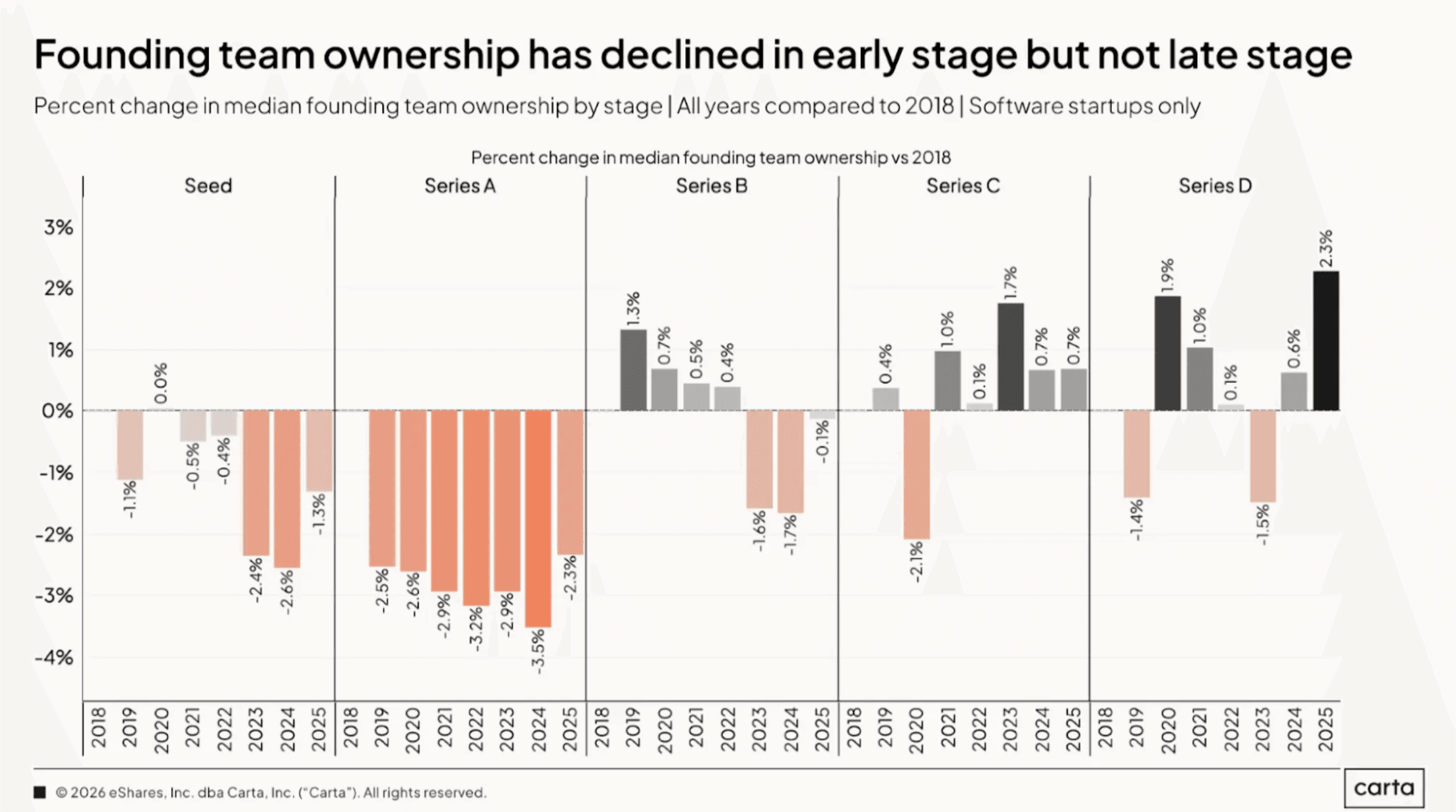 Founding team ownership is split: early-stage founders are facing an equity squeeze while late-stage founders see gains compared to 2018. Seed and Series A ownership hit a low in 2024, down as much as 3.5%. Last year, Series D ownership increased to 2.3% compared to 2018, perhaps pointing to a survivor's premium.