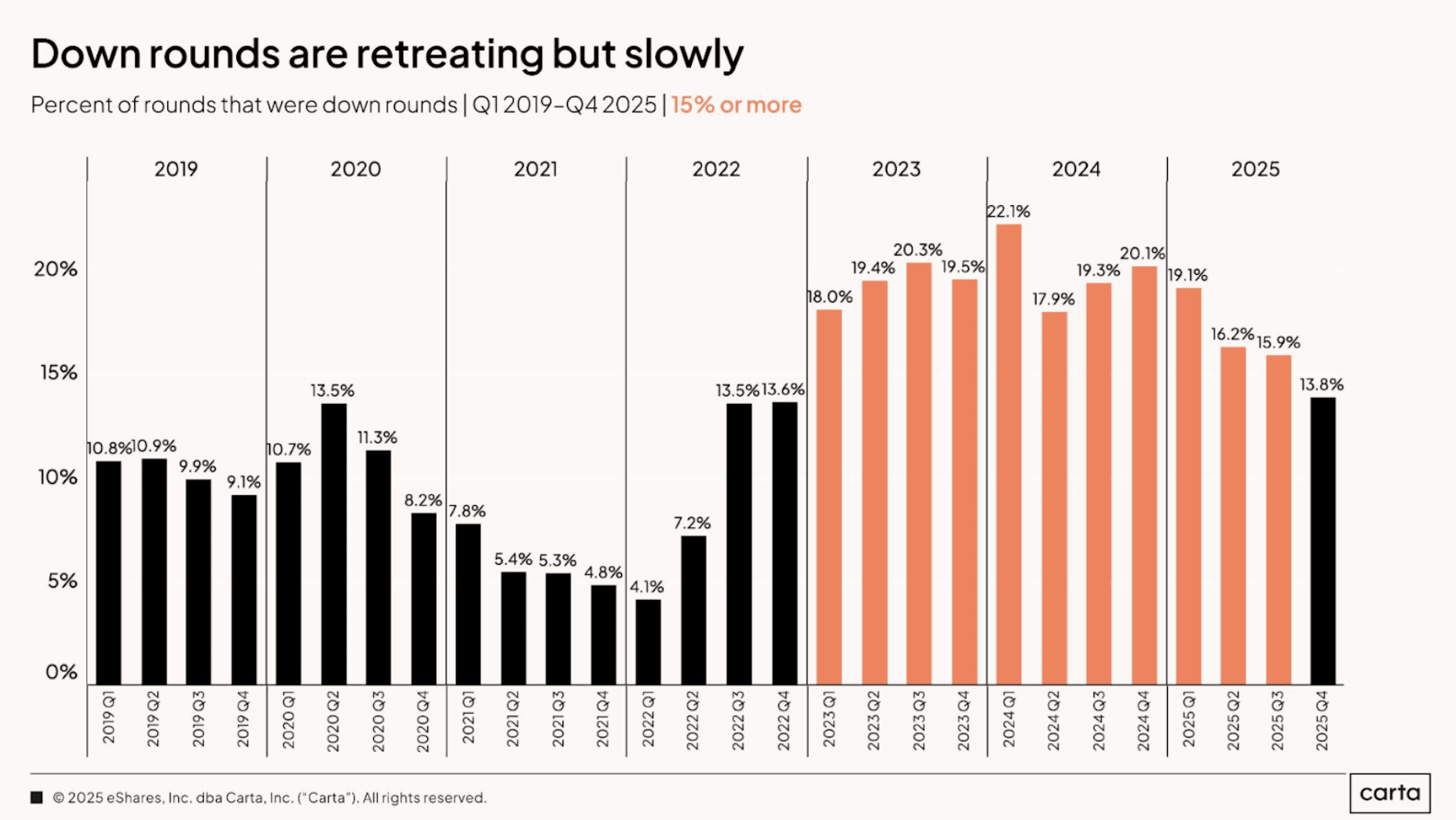 The share of down rounds is falling, down 13% quarter over quarter and 31% year over year. After peaking at more than 22% of all rounds, the era of frequent down rounds appears to be behind us, and the trend is, well, down.