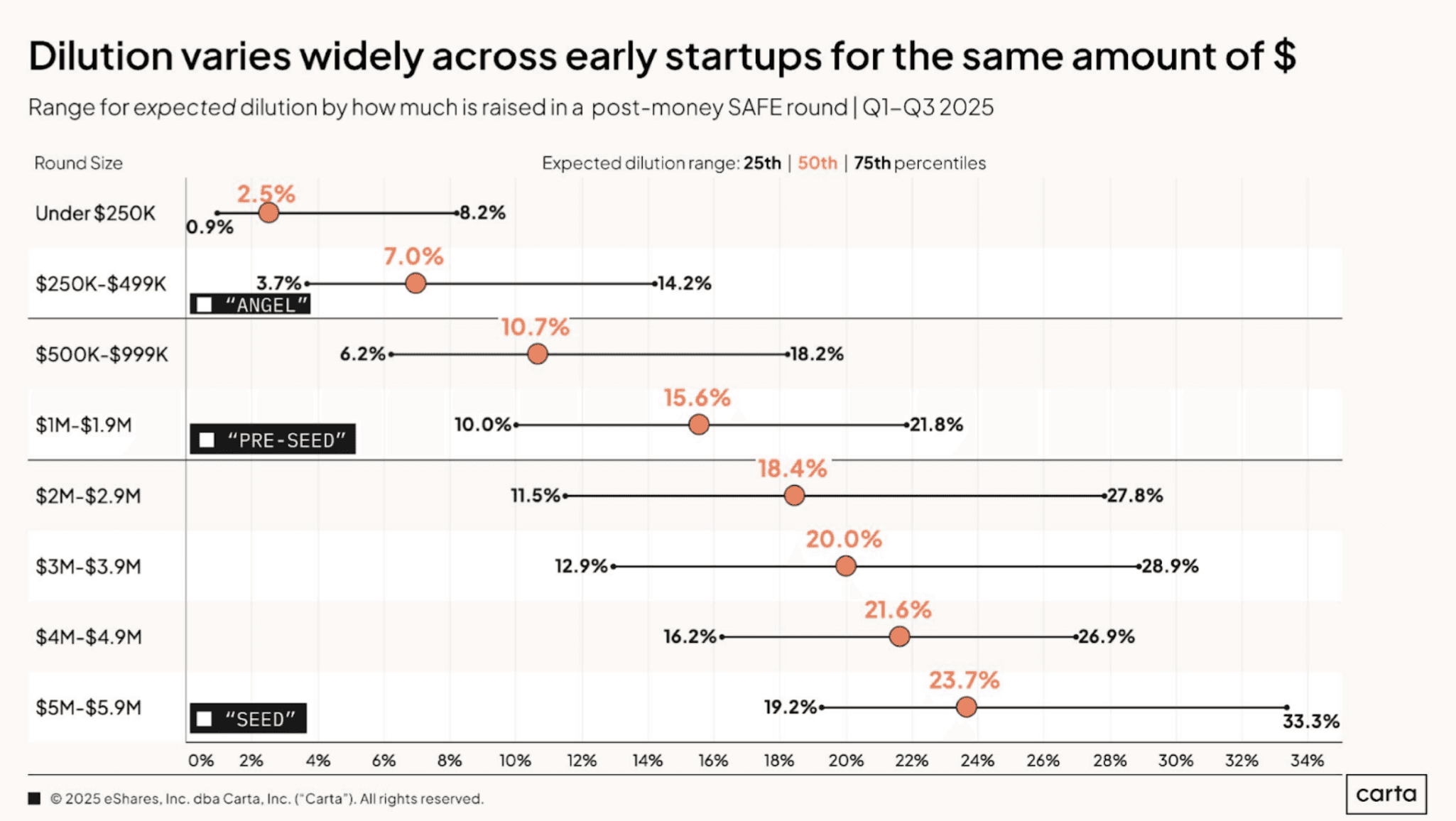 For early-stage startups, median dilution ranges widely, from 2.5% for rounds under $250k to 23.7% for rounds around $5 to 5.9 million, and generally increases with the size of the raise. Pre-seed rounds between $500k and $999k show some of the highest variability, with dilution ranging from 6.2% to 18.2%.