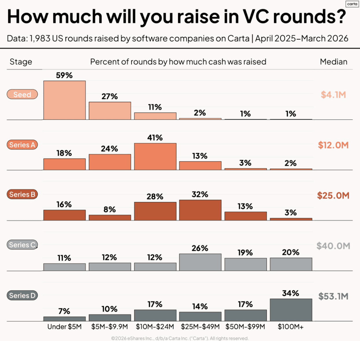 Based on data from April 2025 to March 2026, a majority of Seed rounds (59%) raised under $5 million, with a median raise of $4.1 million. This trend shifts rapidly at Series A, where the median raise nearly triples to $12.0M and most deals (41%) fall into the $10 to $24 million range.