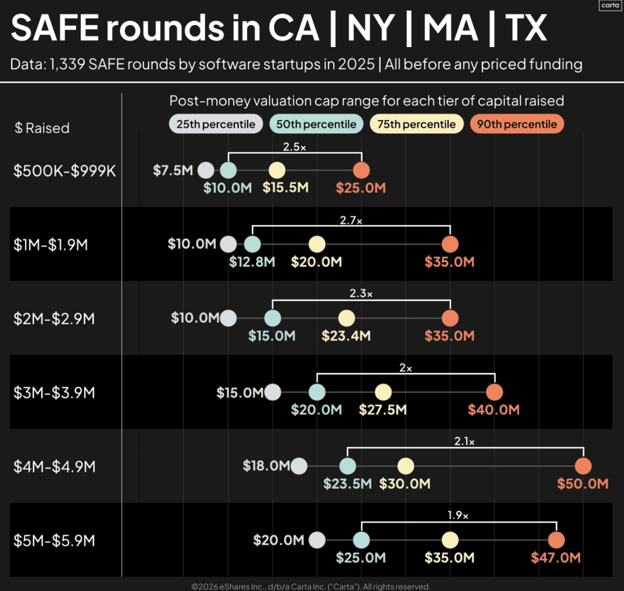 For SAFE rounds, one trend is clear: larger raises correspond to higher post-money valuations. Interestingly, rounds between $4 million and $4.9 million hit a sweet spot, with the 90th percentile of valuation caps topping out at $50 million, the highest across all round sizes.
